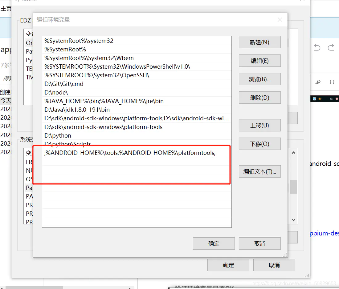 2.在系统变量Path里新加两个路径:%ANDROID_HOME%\platform-tools %ANDROID_HOME%\tools
